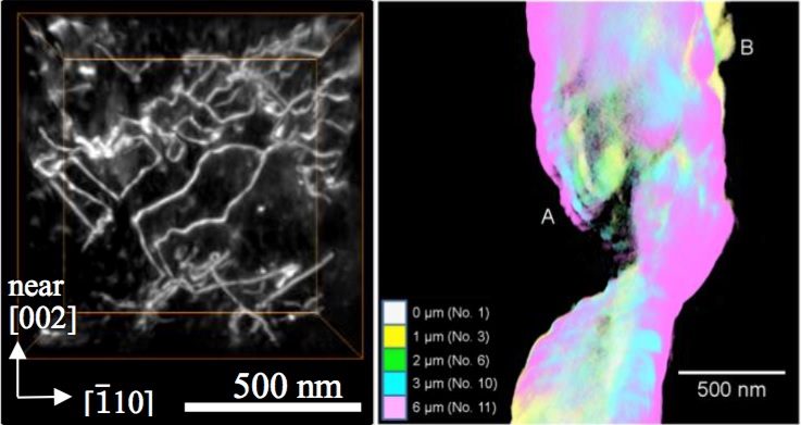 3D observation of dislocations in ferromagnetic iron(left)
